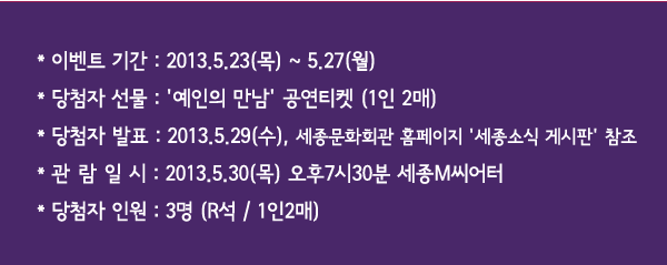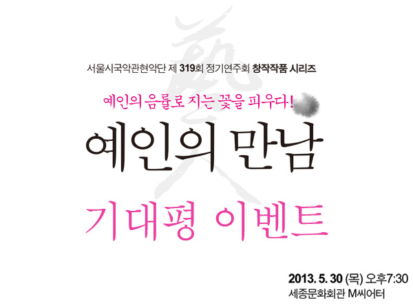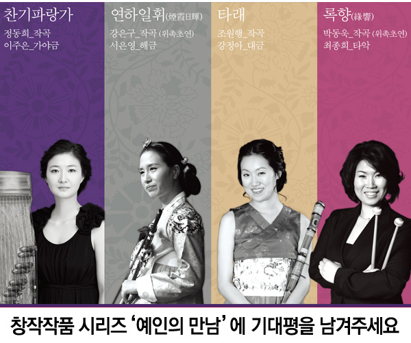 종료 2013-05-23 ~ 2013-05-27 서울시국악관현악단 창작작품 시리즈 예인의 만남 기대평 이벤트 130523_event_ym 종료 2013년 6월 천원의행복 `식구를 찾아서` 공연티켓신청기간(1일~3일) 종료 세종문화회관 프리미엄 회원에 가입하고 사랑하는 사람과 함께 공연으로 힐링 타임 목록보기
