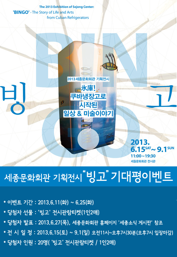 종료 2013-06-11 ~ 2013-06-25 쿠바 냉장고로 시작된 일상&미술이야기展 '빙고(氷庫)' 기대평 이벤트 종료 파이프오르간 골든 듀오 콘서트 렉처 콘서트 유료회원 초청 종료 2013년 6월 천원의행복 `식구를 찾아서` 공연 잔여석 확인기간(7일~공연시작전) 목록보기