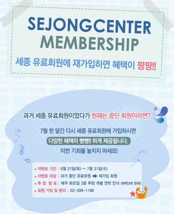종료 2013-06-27 ~ 2013-07-31 세종유료회원에 가입해본 경험이 있다면? 재가입 이벤트 놓치지마세요 종료 연계공연 `태권, 춤을품다` 후기 이벤트 종료 오페라 갈라 `사랑의 묘약` 세종 유료회원 초청 이벤트 목록보기