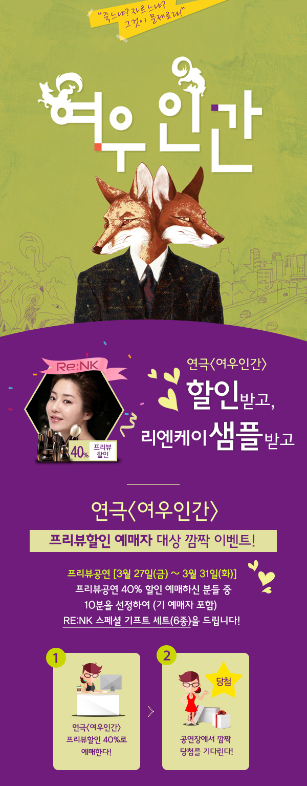 종료 2015-03-26 ~ 2015-03-31 연극 <여우인간> 프리뷰할인 예매자 대상 깜짝 이벤트! 종료 몽블랑과 함께하는`2015 세종 체임버 시리즈` 조기예매 20%할인 종료 뮤지컬 `마법에 걸린 일곱난쟁이` 조기예매 할인 이벤트 목록보기