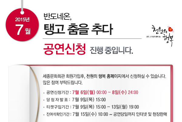 종료 2015-07-06 ~ 2015-07-08 2015년 7월 천원의행복 공연신청(6일~8일) - 반도네온. 탱고 춤을 추다 종료 세종문화회관 예술축제 소나기 MERS BREAKER 댓글이벤트 종료 서울시합창단 제116회 특별연주회 신나는 콘서트 전석1만원 이벤트 목록보기