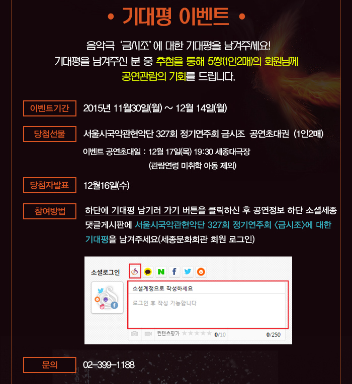 종료 2015-11-30 ~ 2015-12-14 서울시국악관현악단 음악극 ‘금시조’ 기대평 이벤트 종료 “로맨틱콘서트” 예매자 따끈하고 행복한 도서 증정 이벤트 종료 서울시합창단 제141회 정기연주회 `A Celebration of Christmas` 감동2배 이벤트 목록보기