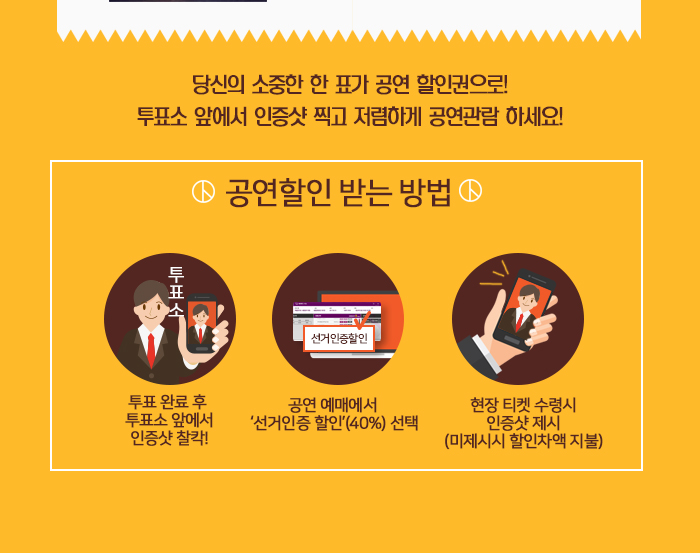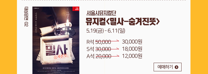 종료 2017-05-08 ~ 2017-06-11 나는 국민이로소이다! 투표 인증샷 할인 이벤트~선착순100명 40%할인! 종료 2017년 5월 천원의행복 시즌 Ⅱ '온쉼표' 티켓신청 및 예매안내 - 5월의온쉼표 국악페스티벌 종료 뮤지컬 `밀사` 5월! 해피티켓 할인 이벤트~ 목록보기