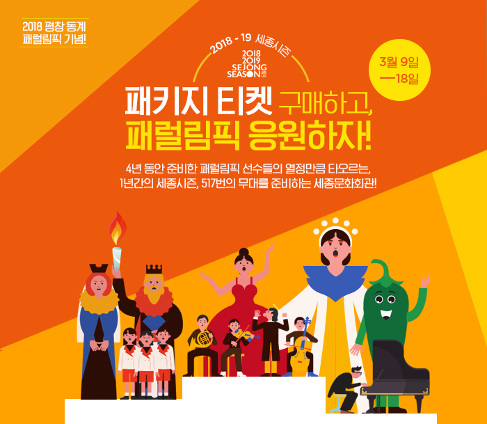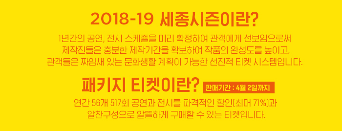 종료 2018-03-09 ~ 2018-03-18 2018-19 세종시즌 패키지티켓 구매하고 패럴림픽 응원하자! 무제 문서 종료 마티네 최강자는 누구?! `오페라 마티네vs앙상블 마티네`세종마티네 4작품 모두 관람시 30%할인! 종료 2018-19 세종시즌 키즈패키지- 7개 작품중 3개 작품 선택시 40%할인!! 목록보기
